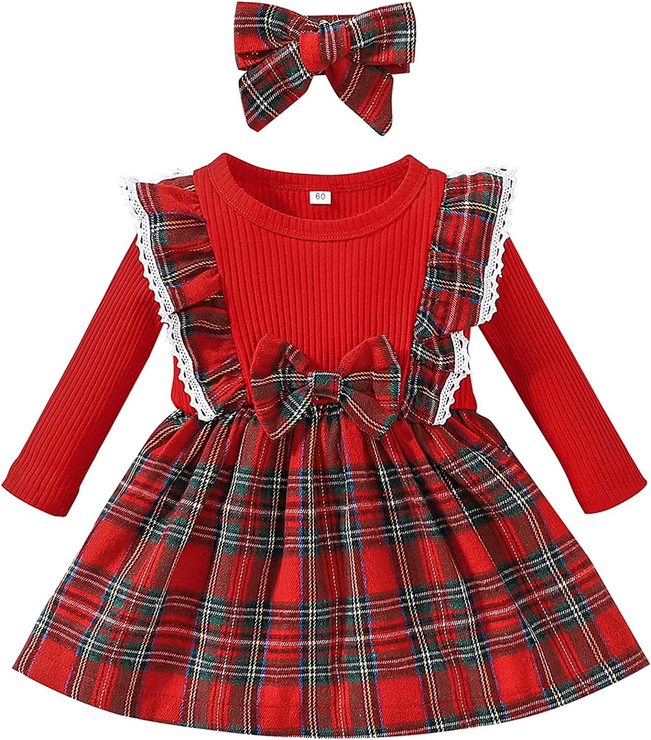 Design:Ribbed top+ Buffalo plaid hem.Long sleeve ruffle Christmas dress,knee-length.