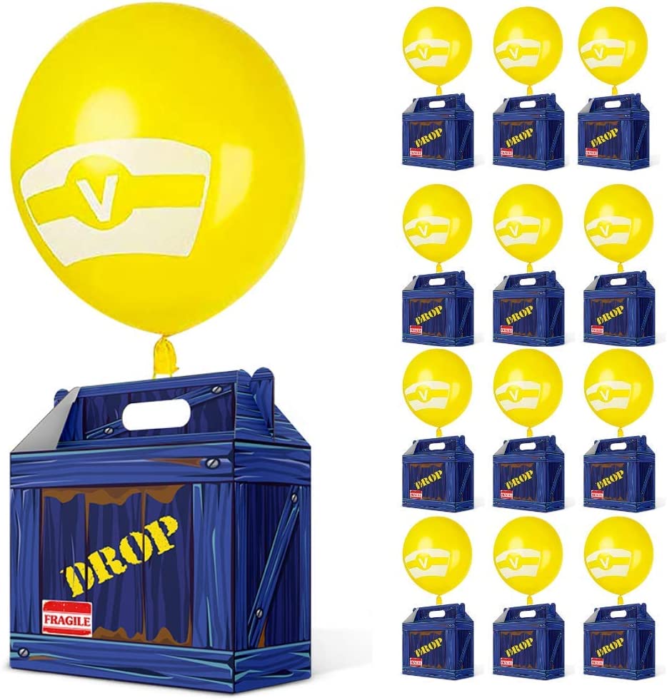 Colorful and interesting – our blue box and yellow supply hanging box balloons are very suitable for storing video game party gifts!