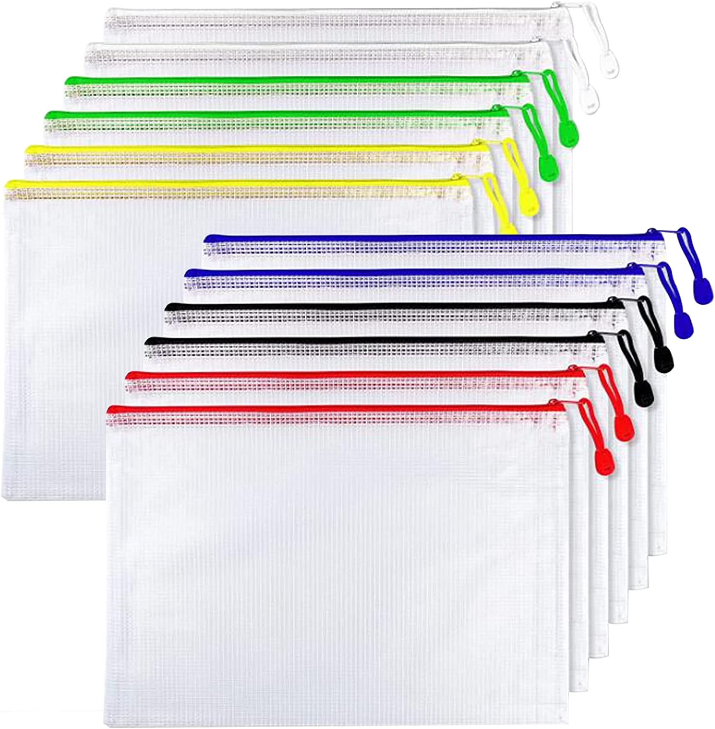 The package contains 12 mesh zipper bags in six different colors, red, yellow, blue, white and black. There are two zipper bags in each color. These zipper bags can help organize documents.
