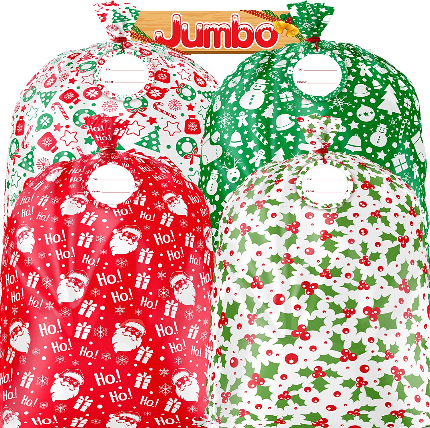 Four large Christmas gift bags, each with a gift tag card and a red rope. After assembling all accessories, wherever they are placed, they can show a strong Christmas atmosphere.